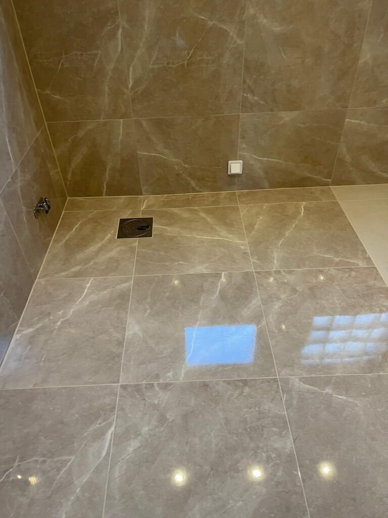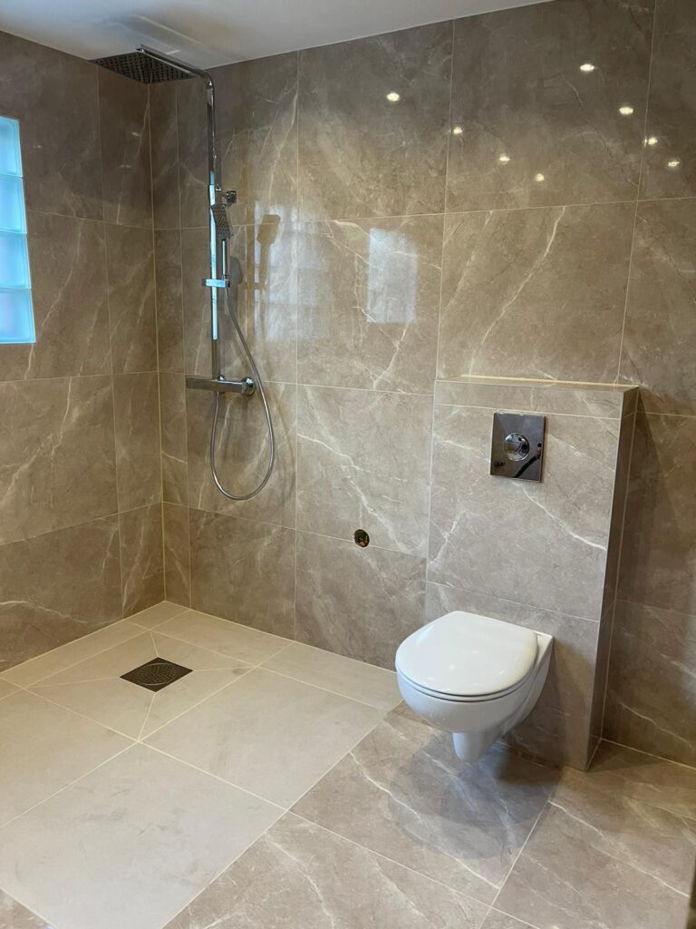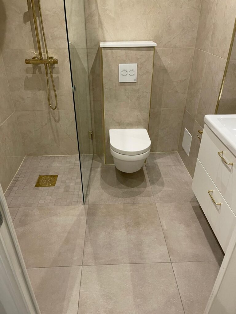 Totalrenovering av ett badrum med nytt kakel, golvvärme och modern inredning.